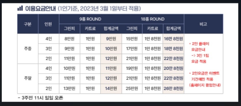 - 주말 9홀 (4인/3인/2인) : 11만원/12만원/14만원