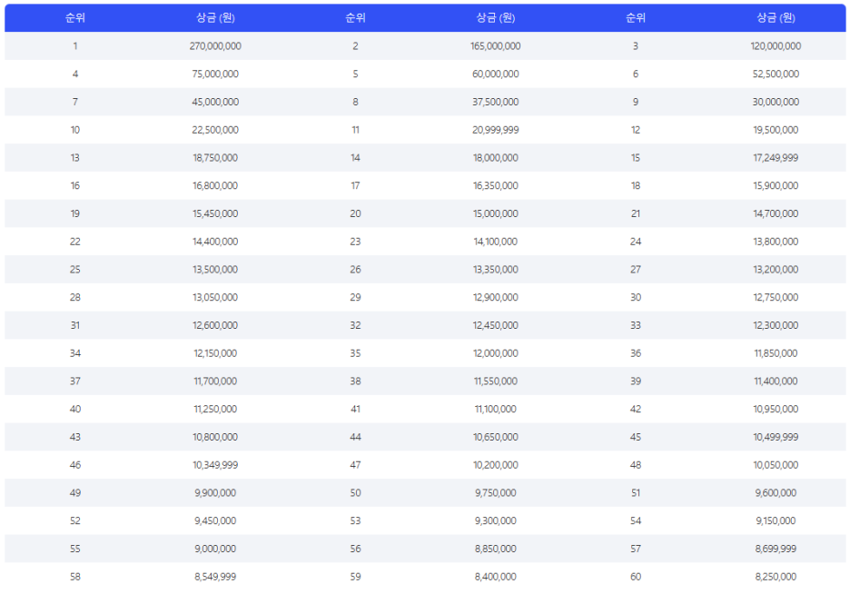 총 108명의 선수 중 60명의 선수가 상금을 받습니다. 우승자는 2억 7천만원, 최저 상금 825만원 입니다.