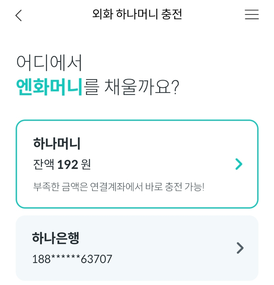 하나머니로 누르면 가능한 금액은 하나머니로, 나머지 금액은 하나은행 연계통장에서 인출 됩니다.