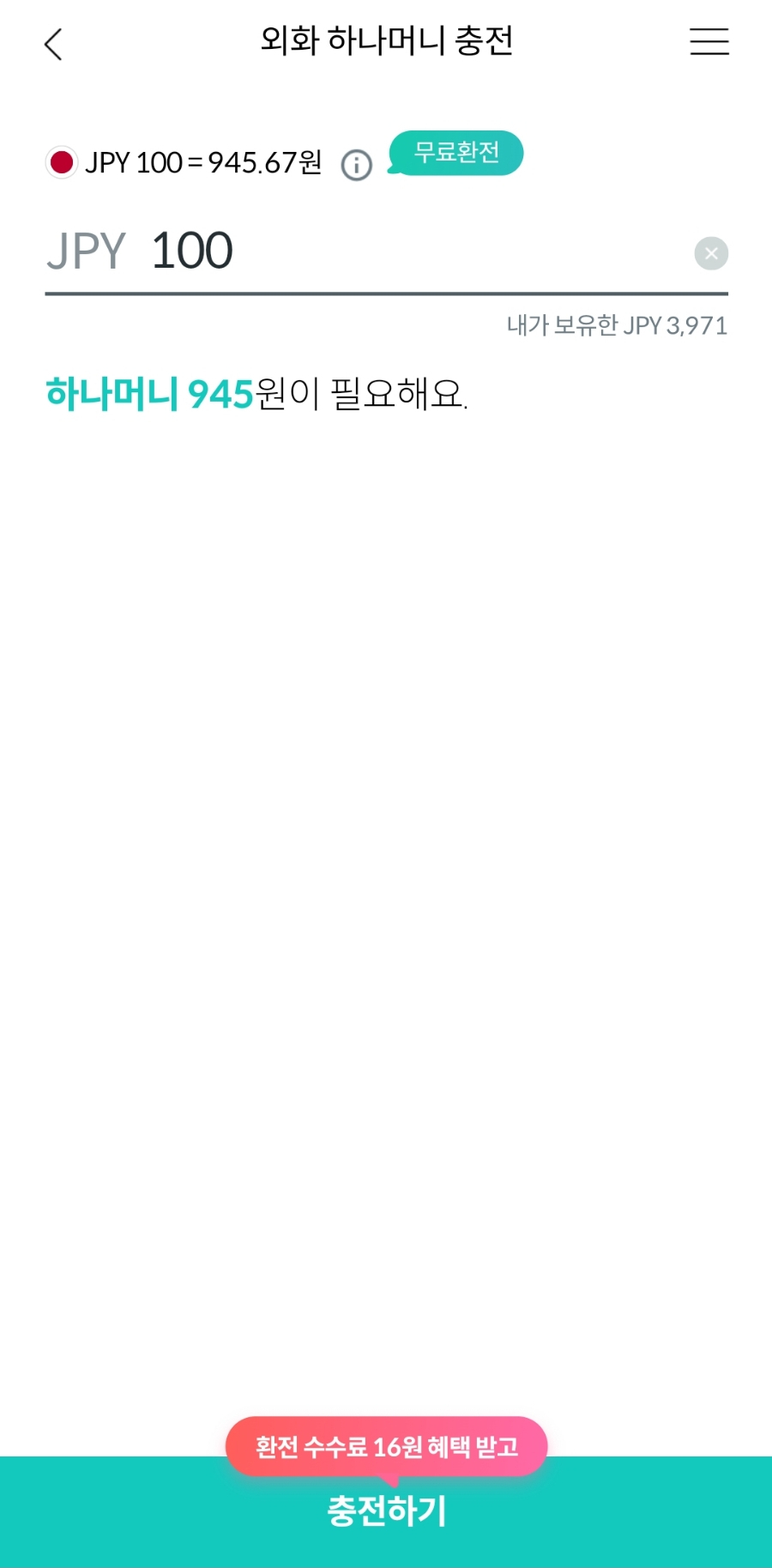 원하는 외화 금액을 입력하면, 얼마의 하나머니가 필요한지와 함께 하단에 환전되서 수수료 혜택 금액이 나옵니다.
