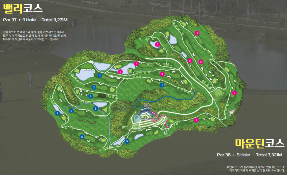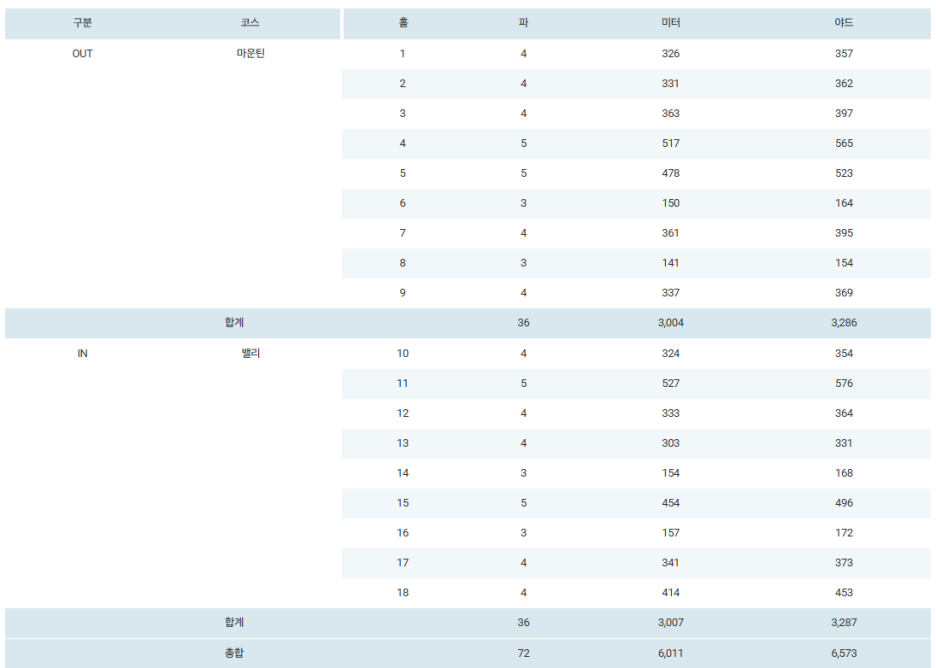 경기코스는 OUT인 마운틴과 IN코스인 밸리로 구성되어 있으며, 총 전장은 6,573미터, 6,011 야드 입니다.