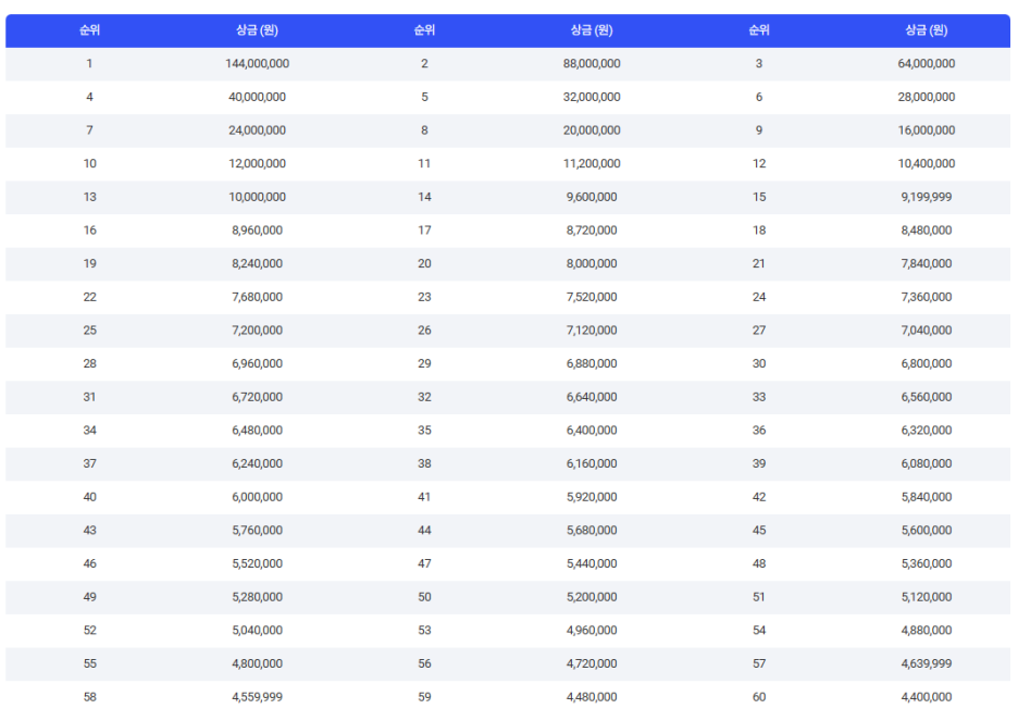 총 144명의 선수 중 60명의 선수가 상금을 받습니다. 우승자는 1억 4천 4백만원, 최저 상금 440만원 입니다.