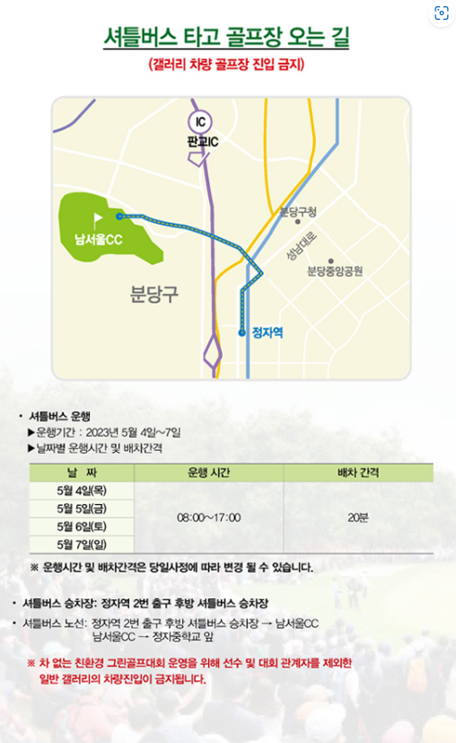 차 없는 친환경그린골프대회 운영을 위해 선수 및 대회 관계자를 제외한 일반 갤러리의 차량진입이 금지됩니다.