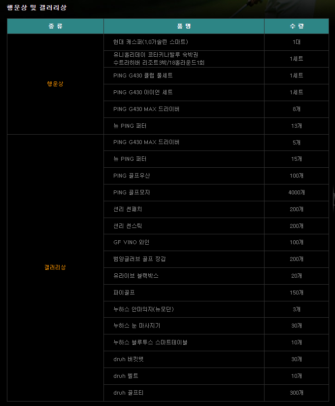 갤러리 경품이 어마어마한데, 가장 많이주는 PING 골프모자가 4,000개니깐 최소한 모자는 받을수 있을까 싶긴합니다.