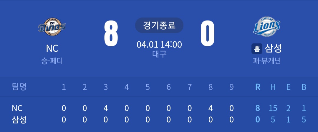 NC 다이노스 8 (승) : 삼성 라이온즈 0 (패)
