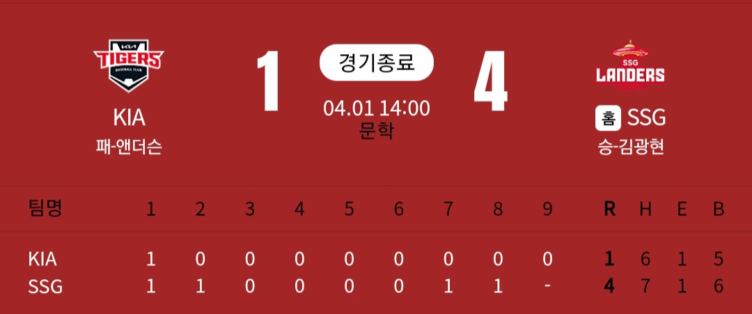 기아 타이거즈 1 (패) : SSG 랜더스 4 (승)