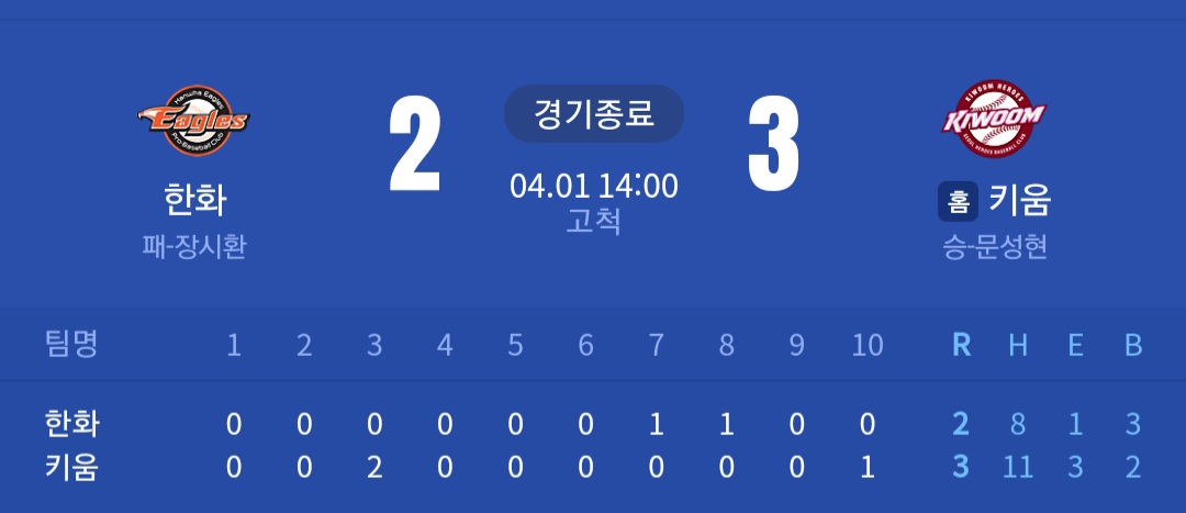 한화 이글스 2 (패) : 키움 히어로즈 3 (승)