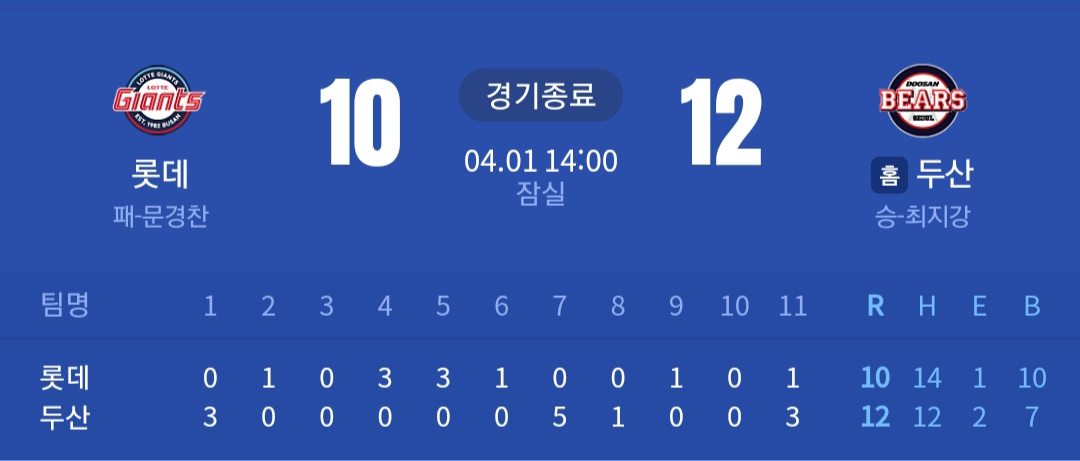 롯데 자이언츠 10 (패) : 두산 베어스 12 (승)