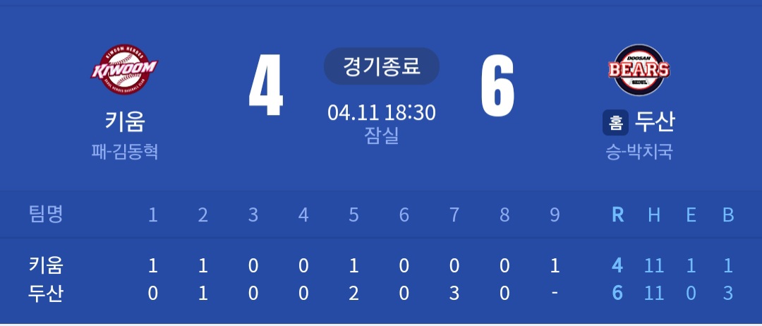 키움 히어로즈 4 (패) vs 두산 베어스 6 (승)