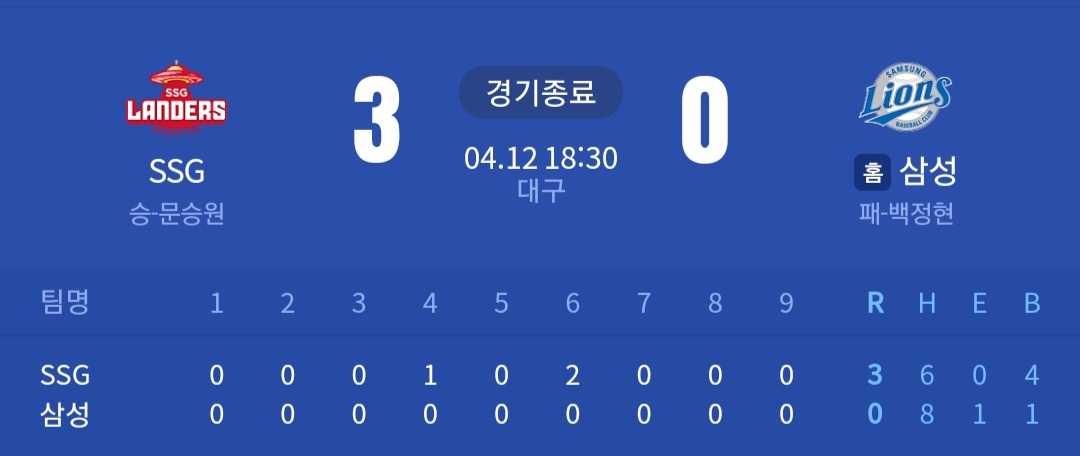 SSG 랜더스 3 (승) vs 삼성 라이온즈 패 (0)