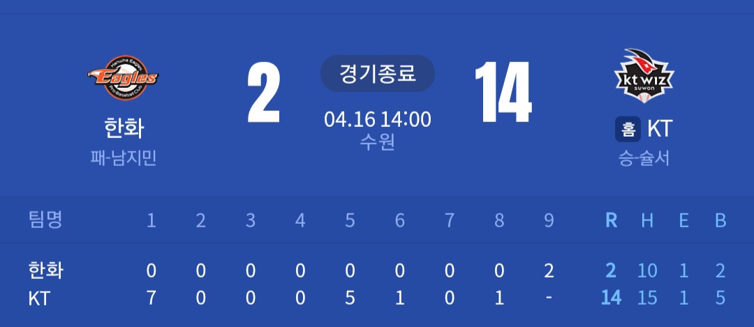 한화 이글스 2 (패) vs KT 위즈 14 (승)