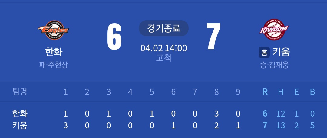 한화 이글스 6 (패) : 키움 히어로즈 7 (승)
