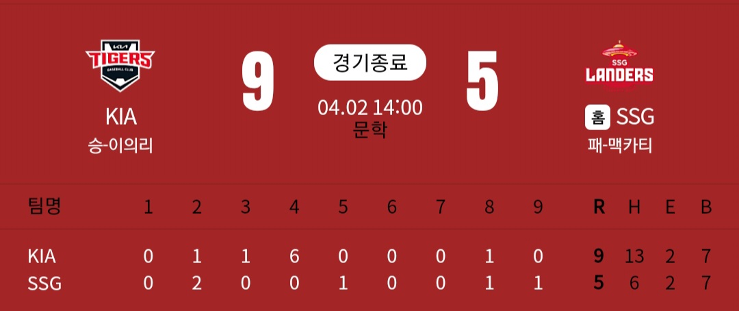KIA 타이거즈 9 (승) : SSG 랜더스 5 (패)