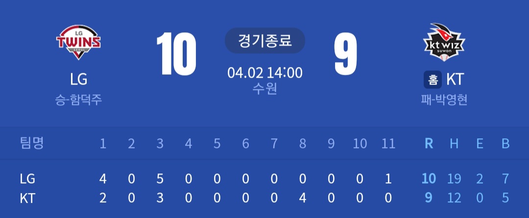 LG 트윈스 10 (승) : KT 위즈 9 (패)