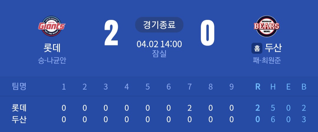 롯데 자이언츠 2 (승) : 두산 베어스 0 (패)