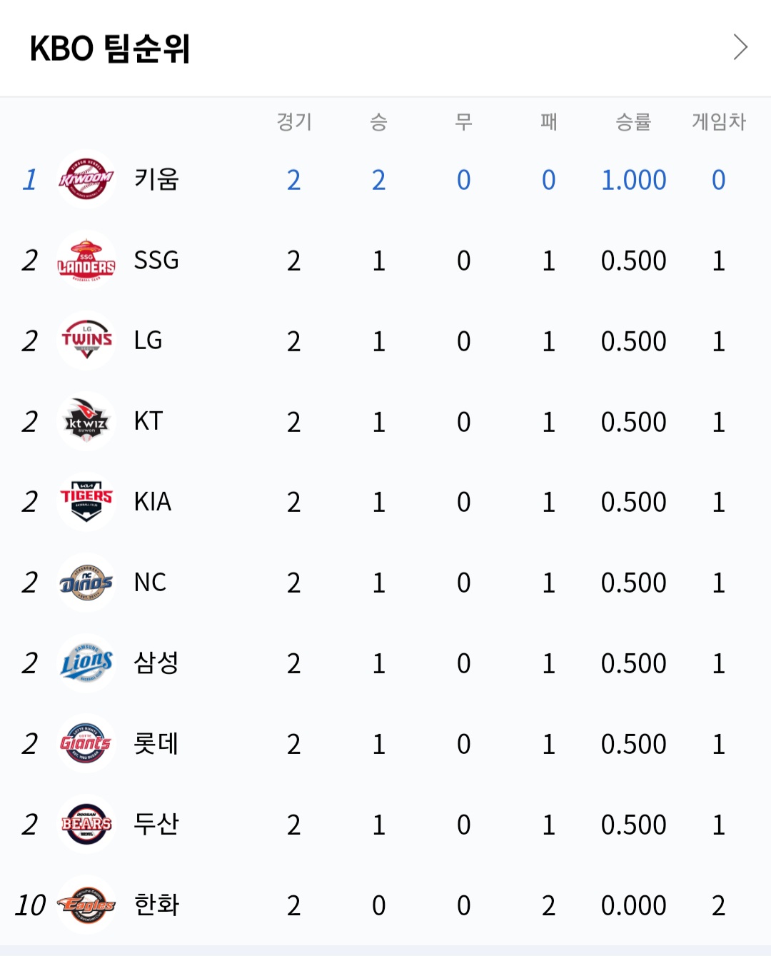 공동 2위 : SSG 랜더스 / LG 트윈스 / KT 위즈 / KIA 타이거즈 / NC 다이노스 / 삼성 라이온즈 / 롯데 자이언츠 / 두산 베어스 (1승 1패)