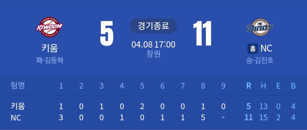 키움 히어로즈 5 (패) : NC 다이노스 11 (승)