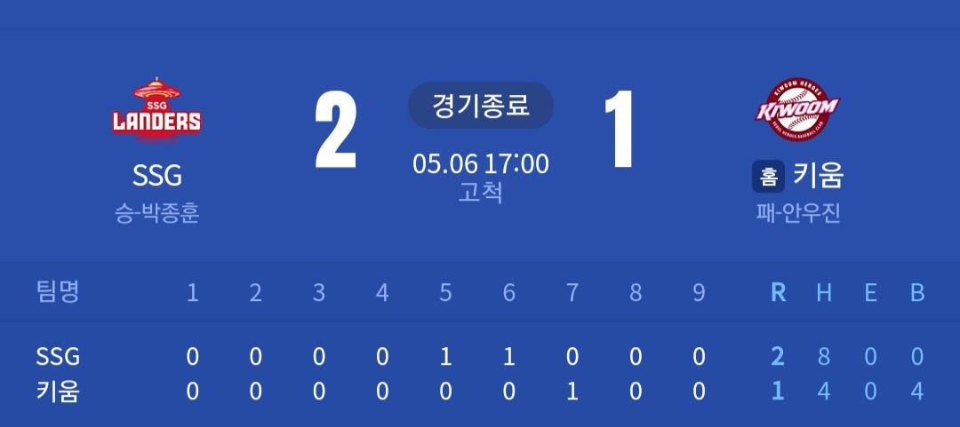 SSG 랜더스 2 (승) vs 키움 히어로즈 1 (패)