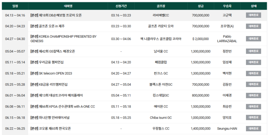 2023년 투어시즌은 총 24개의 대회로 구성되어 있고, 7/15일 기준으로 11개 대회가 완료되었고, 휴식기를 마치고 7월 20일 진행예정인 아너스 K 솔라고CC 한장상 인비테이셔널 이후 다시 한달의 휴식 후 총 12개 대회가 남아있습니다.