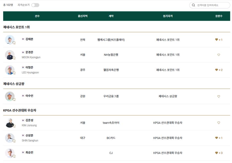 이번 대회는 총 102명의 선수가 참가합니다.