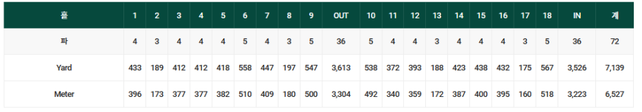 경기코스는 OUT 코스와 IN 코스로 총 전장은 7,139 야드, 6,527 미터 입니다.