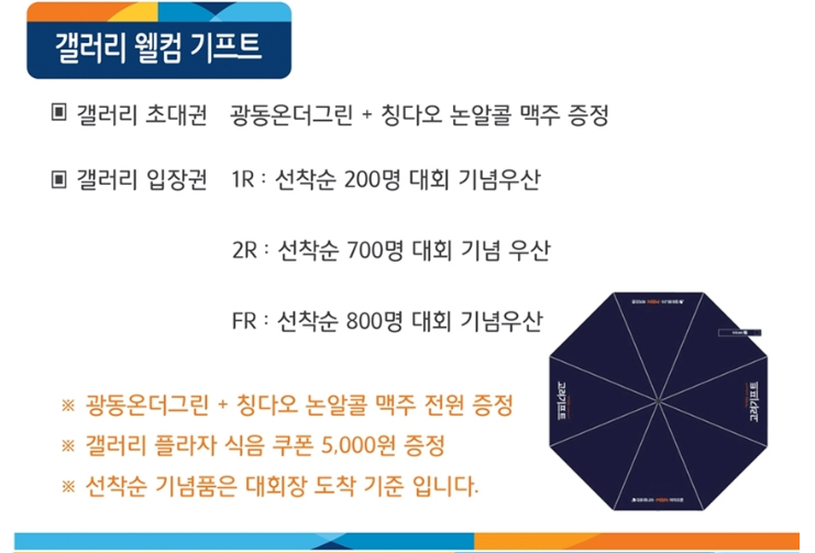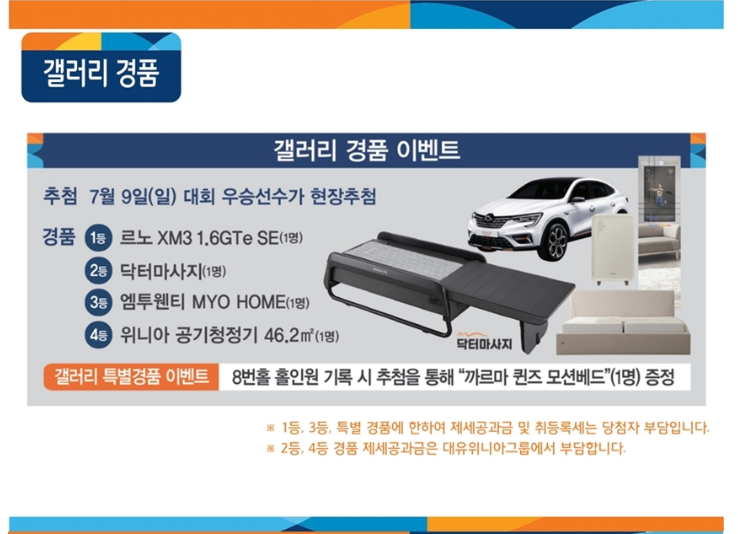 갤러리 행운권 추첨은 7월 9일 대회 우승선수가 현장 추첨하며, 상품은 아래와 같습니다.