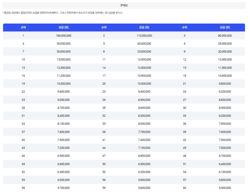 총 144명의 선수 중 60명의 선수가 상금을 받습니다. 우승자는 1억 8천만원, 최저 상금 550만원 입니다.