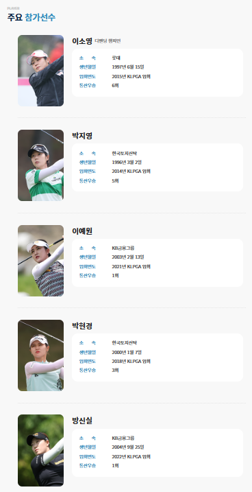 전년도 우승자인 이소영 프로를 비롯해서, 지난주 맥콜모나용평오픈 우승자인 고지우 프로, 박지영 프로, 이예원 프로, 박현경 프로, 그리고 요즘 화끈한 장타로 화제의 주인공인 방신실 프로 등이 출전합니다.