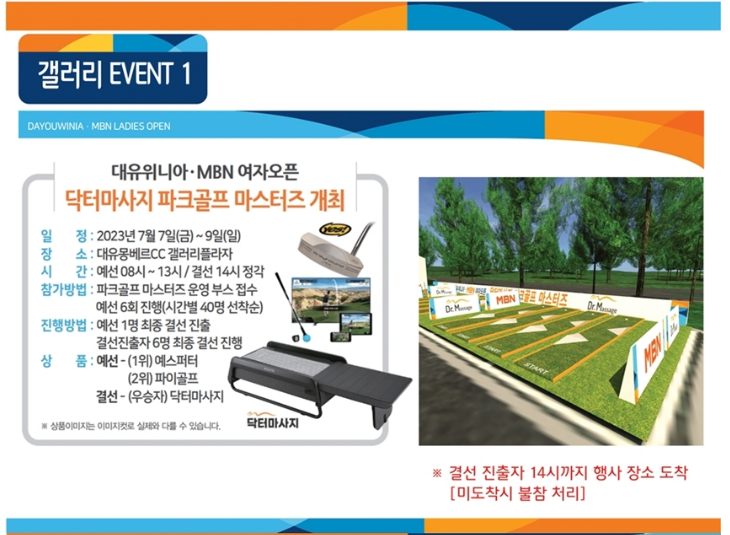 대유위니아 MBN 여자오픈 대회 기간 동안에는 대유몽베르CC 내 주차가 불가 합니다.