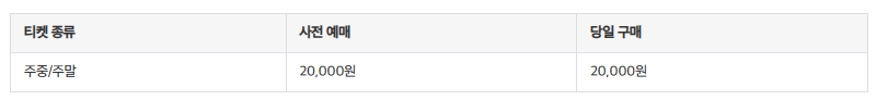 입장료는 주중/주말/사전예매/당일구매 동일하게 2만원 입니다.