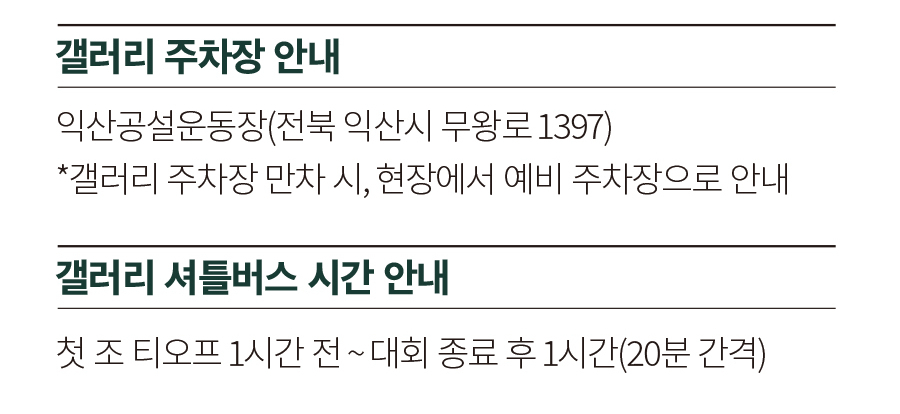 갤러리 셔틀버스는 첫조 티오프 1시간 전 부터 대회 종료 후 1시간까지 20분 간격으로 운영합니다.