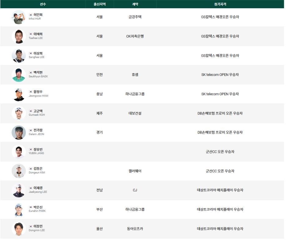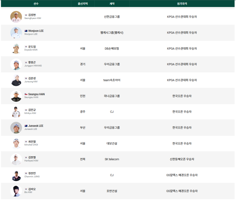 김성현, 이원준, 문도엽, 황중곤, 이준석, 김한별, 정찬민, 김비오 선수도 참가합니다.