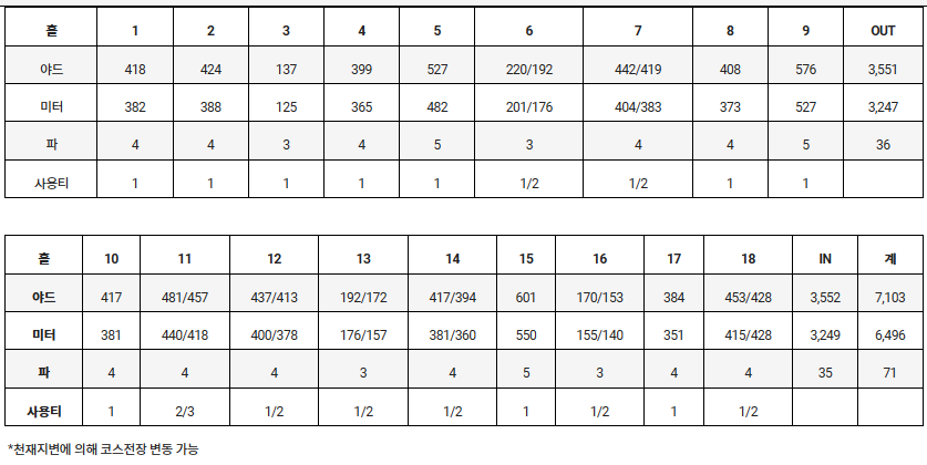 경기코스는 파 71로 파인코스와 레이크코스로 총 전장은 7,103 야드, 6,496 미터 입니다.