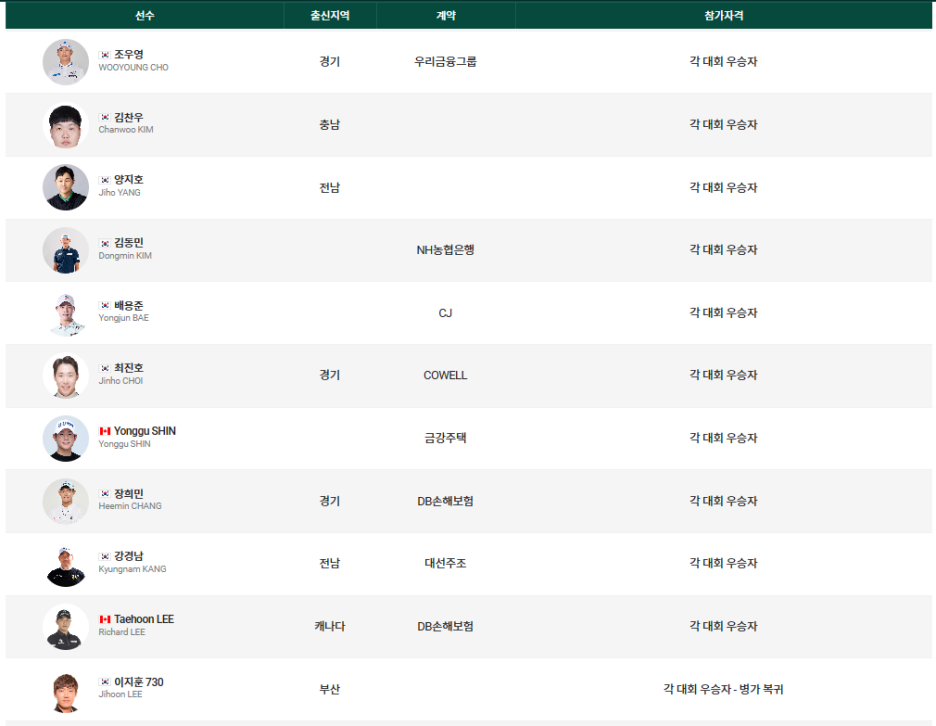 3승의 고군택 선수를 비롯하여, 항저우 아시안게임 금메달 리스트인 장유빈 선수, 그리고 허인회, 이태희, 함정우, 전가람, 이재경 선수도 참가합니다.