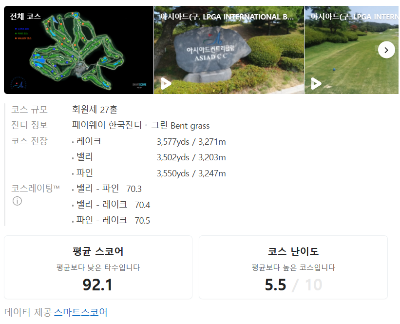 스마트스코어 상에서는 5.5점으로 중간정도 코스고, 평균 스코어는 92.1인 곳 입니다.