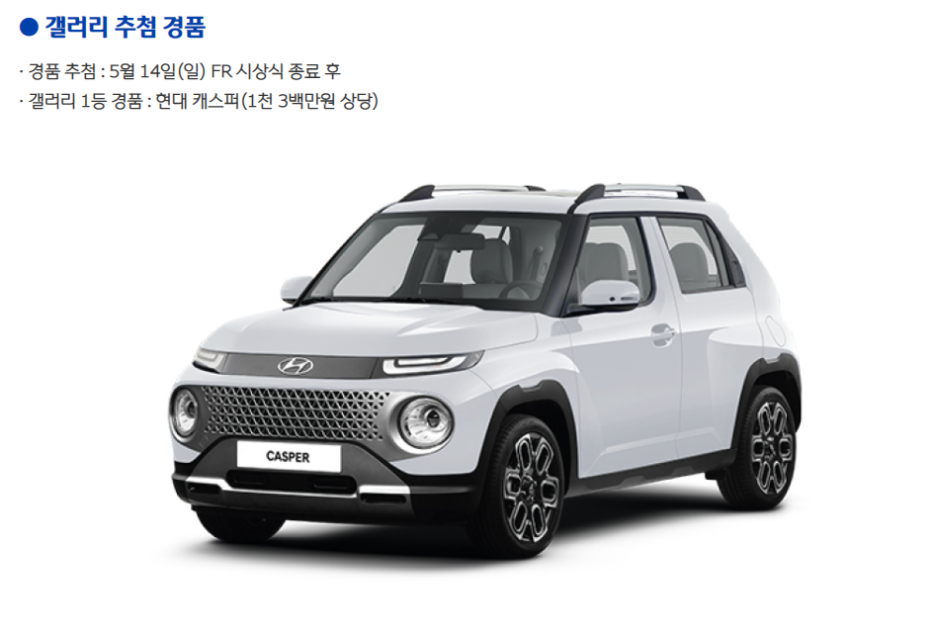1등은 현대 캐스퍼, 그 외 세라젬 파우제, 마스터V6, 로봇 청소기 등 입니다.