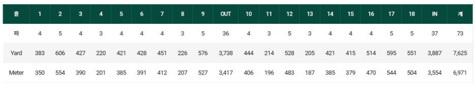 파73 코스로 전장은 6,971 미터, 7,625 야드입니다.