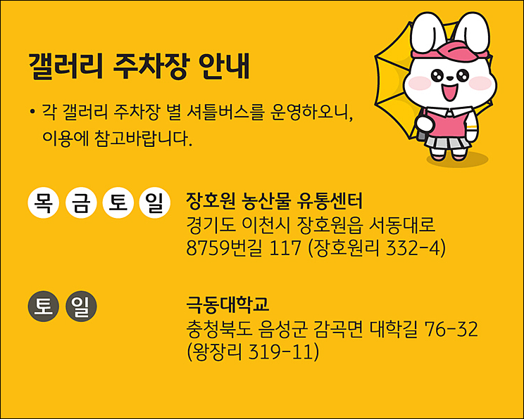 주말에만 추가로 운영하는 갤러리 주차장은 극동대학교 주차장 입니다.