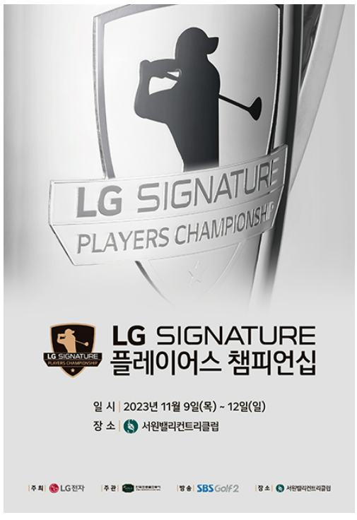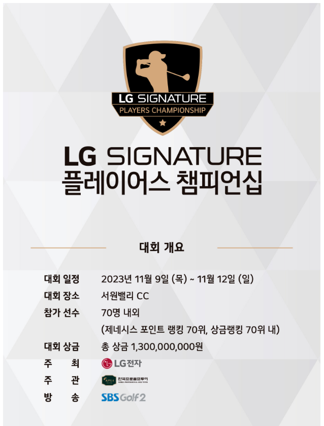 총상금 13억 원, 우승상금 2.6억원에 달하는 2023 LG SIGNATURE 플레이어스 챔피언십 KPGA 골프 대회를 경기 파주에 위치한 서원밸리 CC에서 2023년 11월 9일(목)부터 12일(일)까지 개최됩니다.