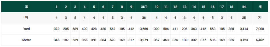 경기코스는 밸리 OUT 코스와 서원 IN 코스로 총 전장은 7,000 야드, 6,402 미터 입니다.