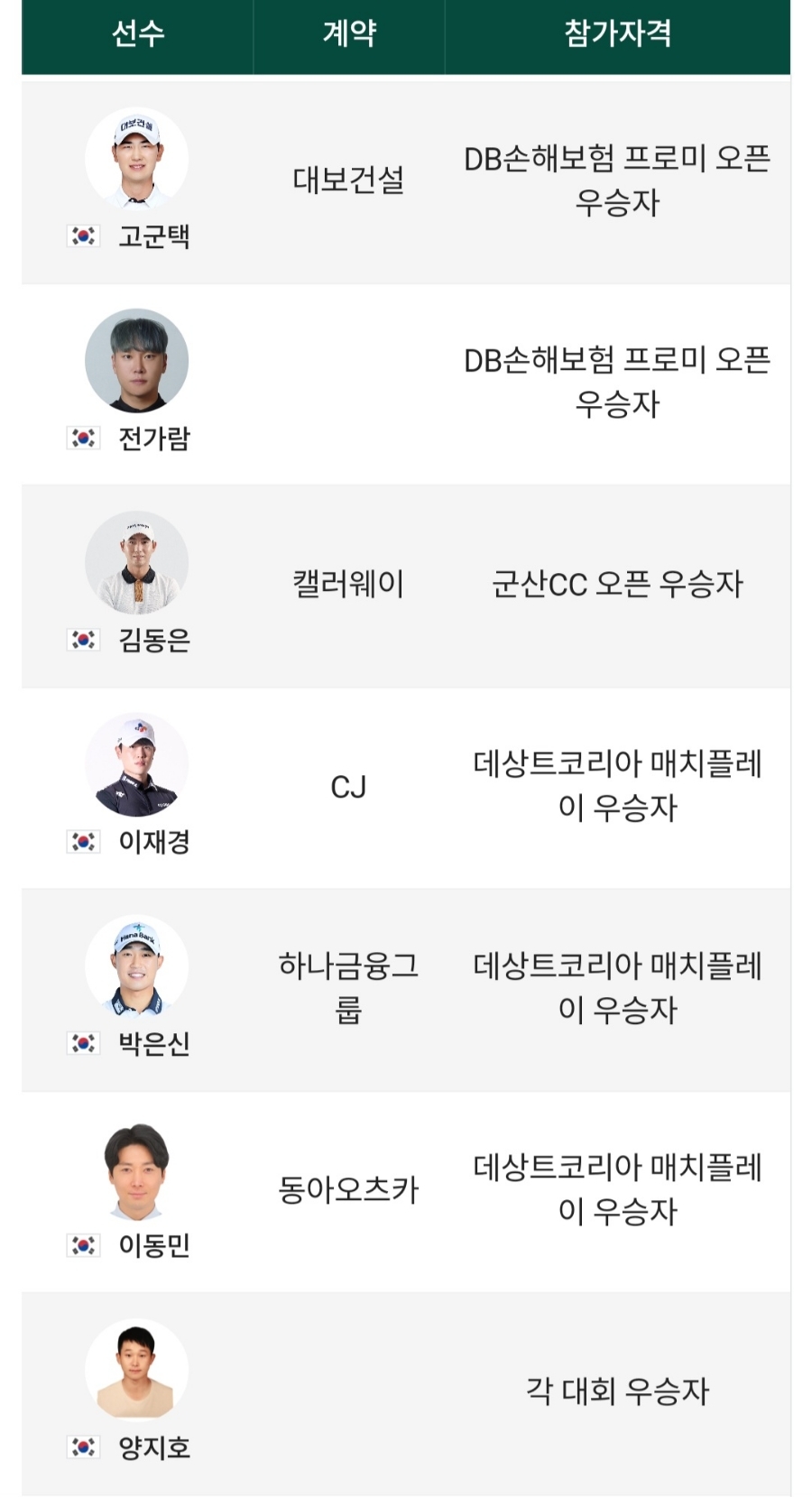 김동민, 배용준, 최진호, 신용구, 장희민, 강경남, 등 우승자 선수들과 함께 제네시스포인트 70위 이내 등 다양한 참가자격의 선수들이 참가하네요.