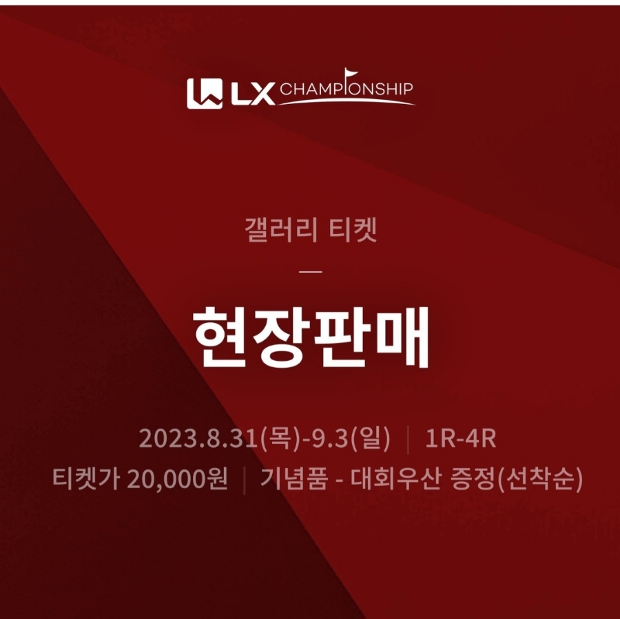 2023 LX Championship의 갤러리 티켓은 현장 판매로만 진행하며, 모든 라운드가 2만원으로 동일한 가격 입니다. 기념품으로는 대회우산을 선착순으로 증정한다고 하네요.