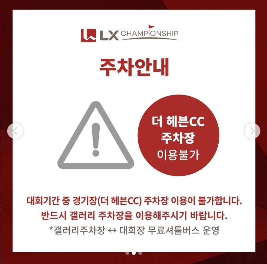 대회기간 중 경기장인 더헤븐 CC 주차장 이용이 불가하며, 갤러리 주차장을 반드시 이용해야합니다.