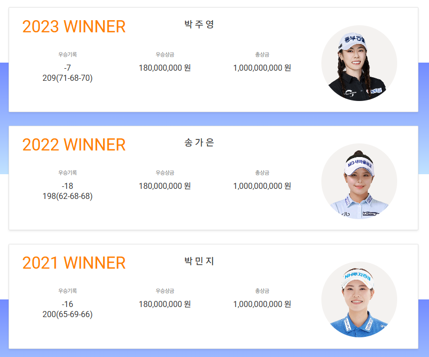 1회 대회인 2021년 우승자는 박민지 선수,  2022년은 송가은 선수, 2023년 디펜딩 챔피언은 박주영 선수 입니다.