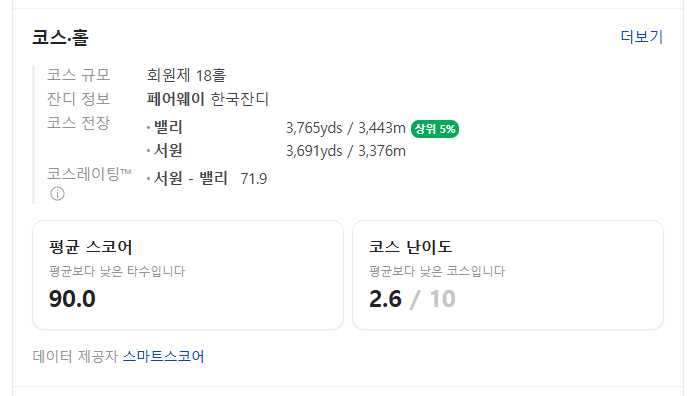 서원밸리CC는 스마트스코어 기준 평균스코어 90타로 평균보다 낮은 타수이며, 코스 난이도도 2.6점으로 낮은 편입니다.