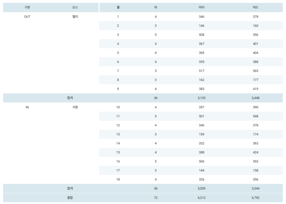 경기코스는 밸리 코스와 서원 코스인데, 총 전장은 6,212 미터, 6,792 야드 입니다.