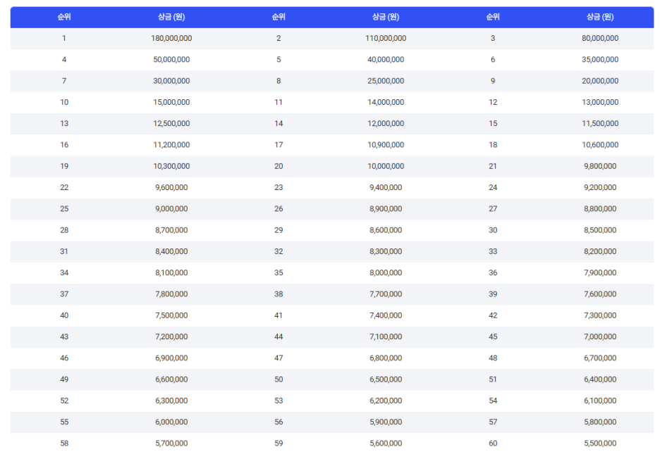 우승자는 1억 8천만원, 최저 상금 550만원 입니다.