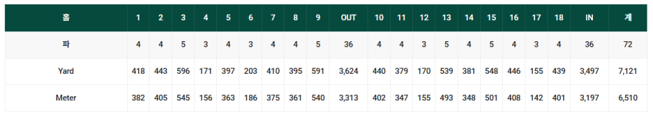 경기코스는 남코스와 서코스인데, 총 전장은 6,510 미터, 7,121 야드 입니다.