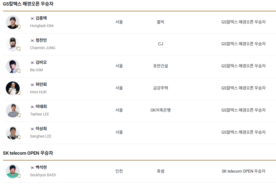 GS칼텍스 매경오픈 우승자 자격으로 김홍택, 정찬민, 김비오, 허인회, 이태희, 이상희