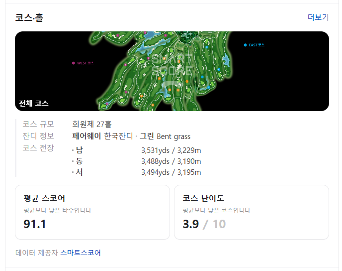 평균 스코어는 91.1타로 평균보다 낮은 타수 코스 난이도는 3.9점으로 평균보다 낮은 코스 입니다.